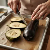 Coupez les aubergines en deux dans la longueur, entaillez la chair.