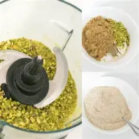 Préchauffez le four à 150°(th5), mixez les pistaches en petits avec la fécule.