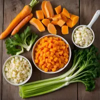 Pelez et coupez le butternut et le céleri-rave en dés, coupez les carottes en rondelles, tranchez finement le céleri et le poireau, émincez l'ail, et hachez finement l'oignon.Étape 2