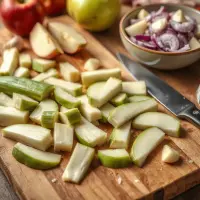 Lavez et coupez les endives en rondelles, les pommes en dés et émincez l'oignon rouge et l'ail.