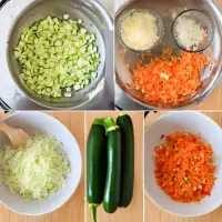 Coupez la courgette et le poivron en dés , râpez la carotte.