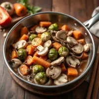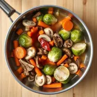Ajoutez les carottes, le poivron rouge, les champignons, les choux de Bruxelles et l'oignon rouge dans la casserole.